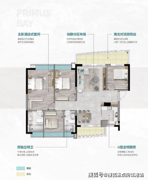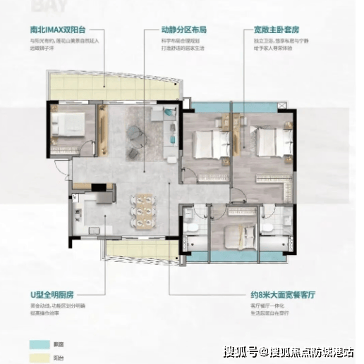 【132㎡四房两厅两卫】——超长采光面,品质改善之选。该户型为四房两厅两卫设计,采用一体式双厅布局,空间开阔,动线流畅,适合改善型家庭居住。双阳台设计,南北对流,采光通风俱佳,既能保证室内空气流通,又能欣赏不同方向的景观;约12.6m超长采光面,让室内每一个角落都能享受充足的阳光,告别阴暗潮湿;所有房间均设置阔景飘窗,增加室内使用空间,同时提升视野体验,闲暇时可坐在飘窗上看书、观景,十分惬意;U型全明厨房,操作便捷,与餐厅紧密相连,上菜、用餐十分方便,提升家庭用餐体验。