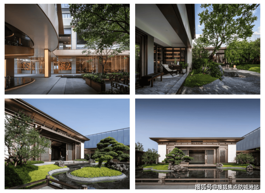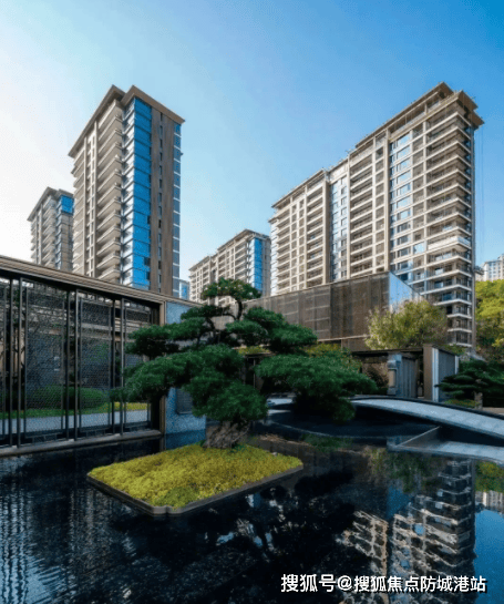 如果说低密板楼是保利天瑞的骨架,那么6.8万平方米的新中式园林则是它的灵魂。项目背靠约5万平方米的山顶公园,将自然的苍翠引入社区,与内部精心打造的园林融为一体,形成了一个巨大的生态绿肺。设计师以“礼道 - 见松 - 步水 - 游廊 - 归堂”为脉络,将中国传统园林的造景手法与现代审美完美结合,营造出一步一景、移步换景的诗意空间。进入社区,首先映入眼帘的是气势恢宏的“礼道”,两侧种植着挺拔的黑松,象征着主人的尊贵与坚韧,让人顿生敬意。沿着小径前行,便来到了“见松”区域,形态各异的松树错落有致,搭配着精致的置石,构成了一幅幅生动的山水画卷。继续深入,“步水”景观带蜿蜒流淌,清澈的水面倒映着蓝天白云和周围的绿植,鱼儿在水中嬉戏,增添了无限生机与灵动。